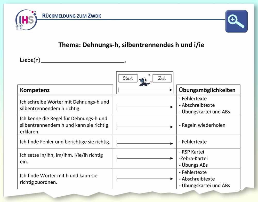 Die Beurteilungen zu den Lernzielkontrollen (an der IHS „Zeig was du kannst!“ / Zwdk) genannt, erfolgt in allen Klassen gemäß einer Tabelle, dem Rückmeldebogen, in der die Lehrkraft ankreuzt, ob sich das Kind im oberen Leistungsbereich (Ziel) oder im unteren Bereich (Start) befindet; in Klasse 4 wird die Tabelle dann durch Noten ergänzt. Die Rückmeldebögen weisen die bewerteten Kompetenzen aus und führen Übungsmöglichkeiten zu den jeweiligen Kompetenzen auf.