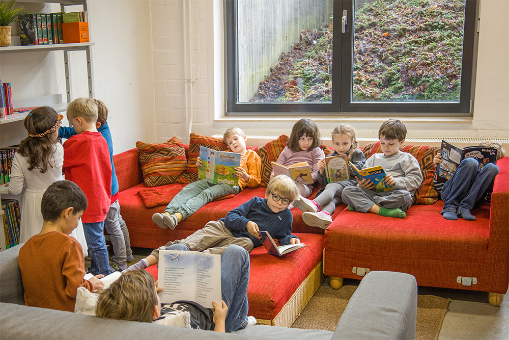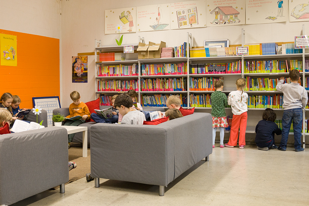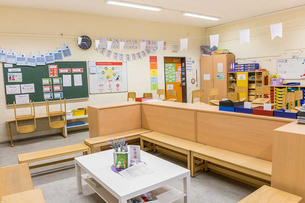 Neben dem Sitzkreis verfügt jeder Klassenraum über eine Leseecke mit kleiner Klassenbücherei, eine Medienecke mit zwei Schüler-PCs, einem Waschbecken mit einem Seifenspender und Papiertüchern sowie den Lernzeitregalen für die Fächer Deutsch, Mathematik, Sachunterricht und Englisch. Die Lernzeitregale sind in jeder Klasse einheitlich in denselben Farben gekennzeichnet (Deutsch = rot, Mathematik = blau, Sachunterricht = grün, Englisch = orange).